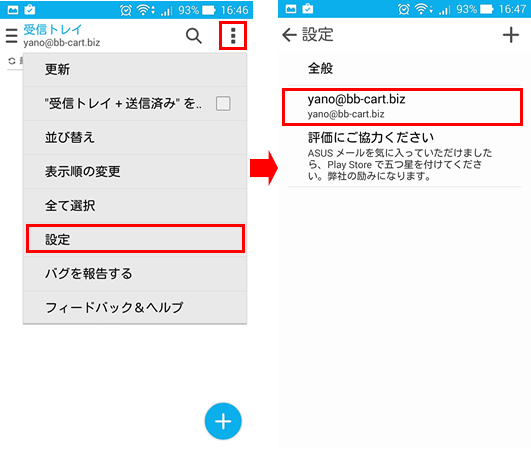 1.メールアプリを起動し、右上のメニューから「設定」を押して次の画面に進み、該当のアカウントを押します。