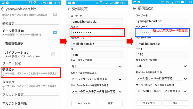 2.「受信設定」を押して画面を進め、「パスワード」「POP3サーバー」を変更し「完了」を押します。