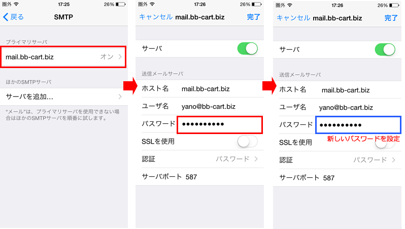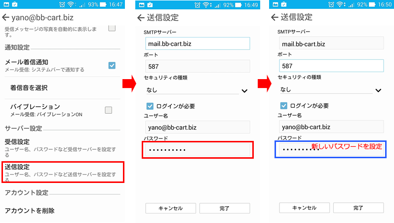 3.前の画面に戻りますので、「送信設定」を押して画面を進め、「パスワード」「SMTPサーバー」を変更し「完了」を押します。