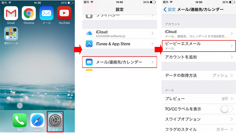 1.「設定アイコン」> 「メール/連絡先/カレンダー」 と進み、該当のアカウントを押します。