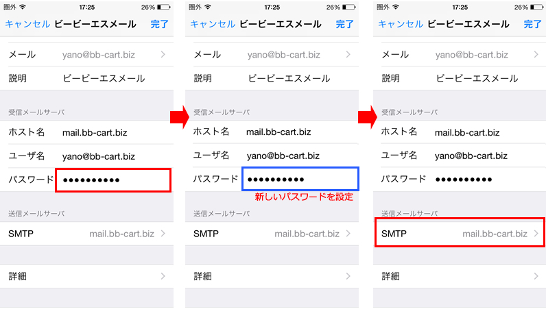 3.該当のサーバー名を押して画面を進め、送信メールサーバーの「ホスト名」「パスワード」を変更し右上の「完了」を押します。