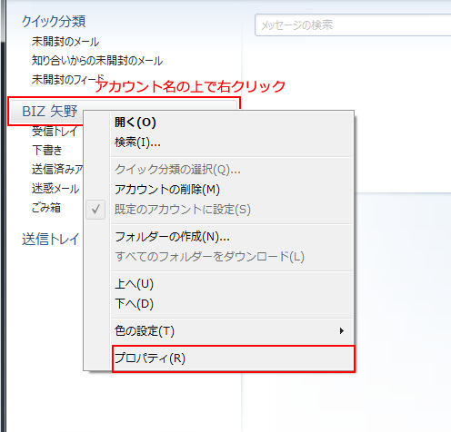 1.フォルダのアカウント名の上で右クリックして「プロパティ」を選択します。