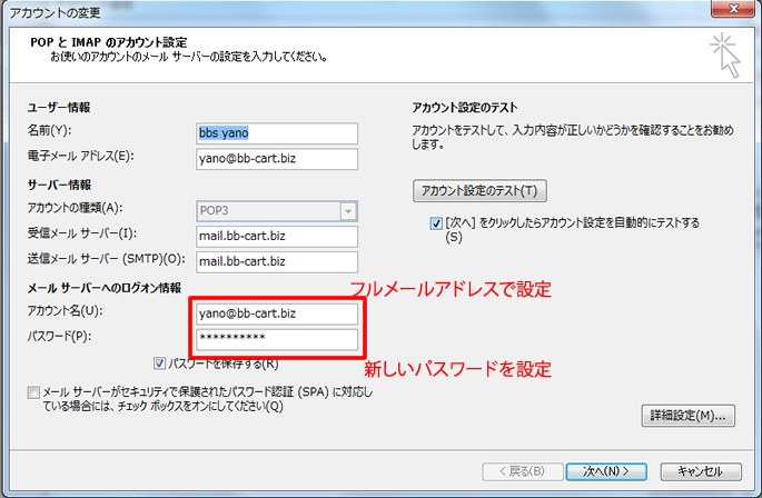 2.開いたウィンドウの「受信・送信メールサーバー名」「アカウント」「パスワード」を変更します。